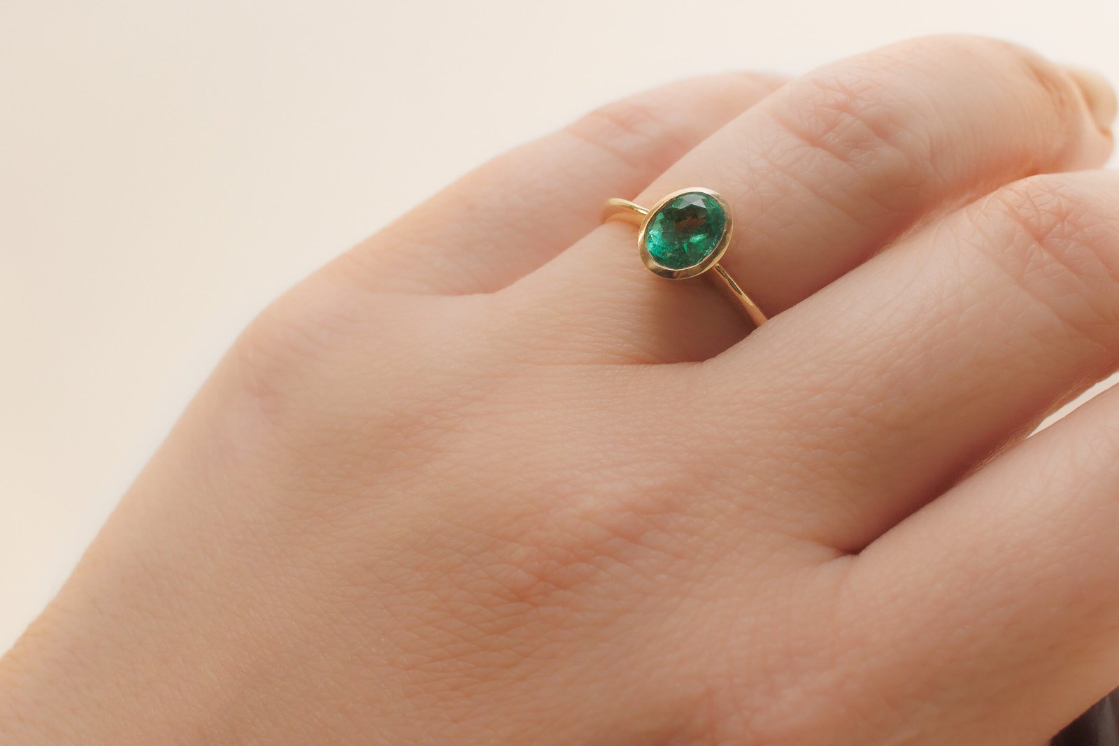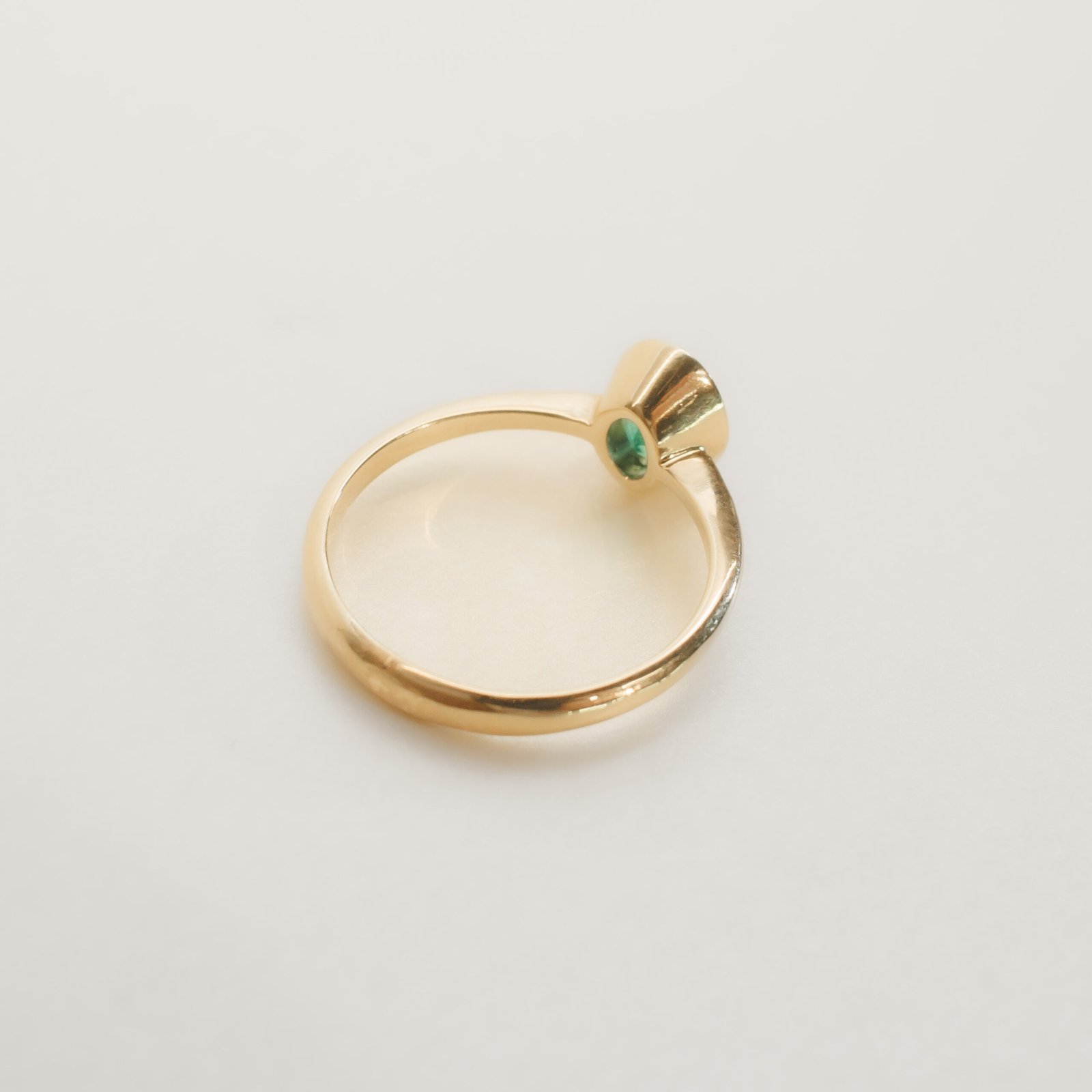 Anillo en oro amarillo de 18k con esmeralda natural colombiana de 0,84 cts talla oval, montada en engaste bisel. Diseño elegante y versátil. Medidas: 6,75 mm x 4,81 mm. Talla del anillo: 6 1/2. Peso del oro: 2,7 grs.